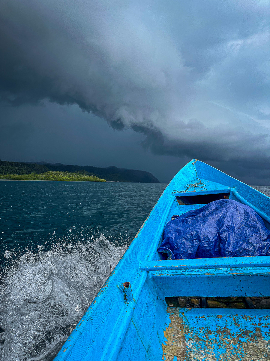 Spet tropska nevihta. Bomo že preživeli, sem si mislila, a nisem pričakovala, da je lahko še veliko hujše. Deževati je začelo tako na gosto, da se ni videlo prsta pred nosom in za nameček je začelo še bliskati in grmeti, mi pa na sredi morja. Še nekaj nesrečnikov se je na naši poti borilo z dežjem in vetrom. K sreči valovi niso bili previsoki in krmar je neustrašno plul v naši smeri, dokler končno nismo zagledali Waigea in našega homestaya Warimpurem.