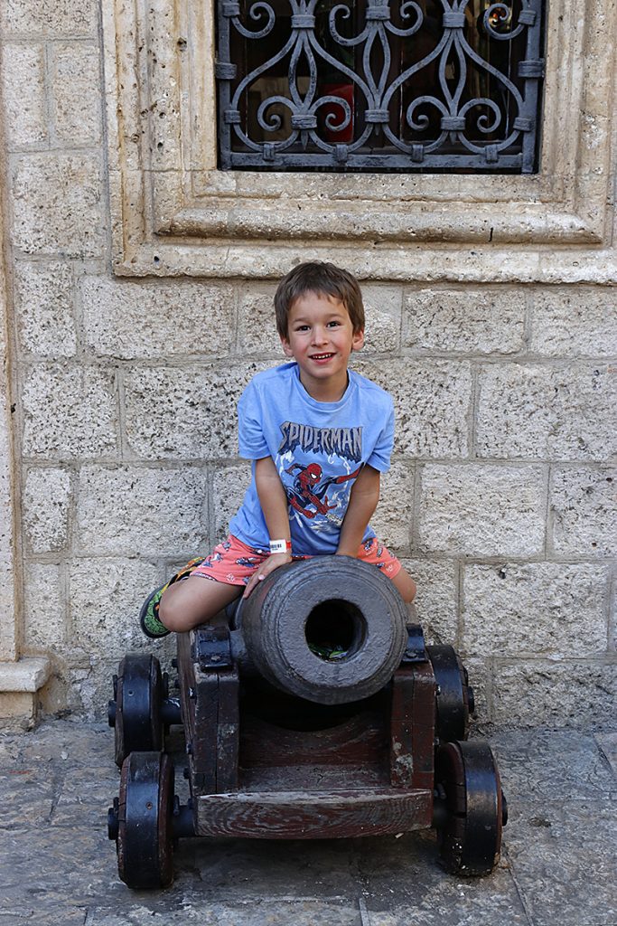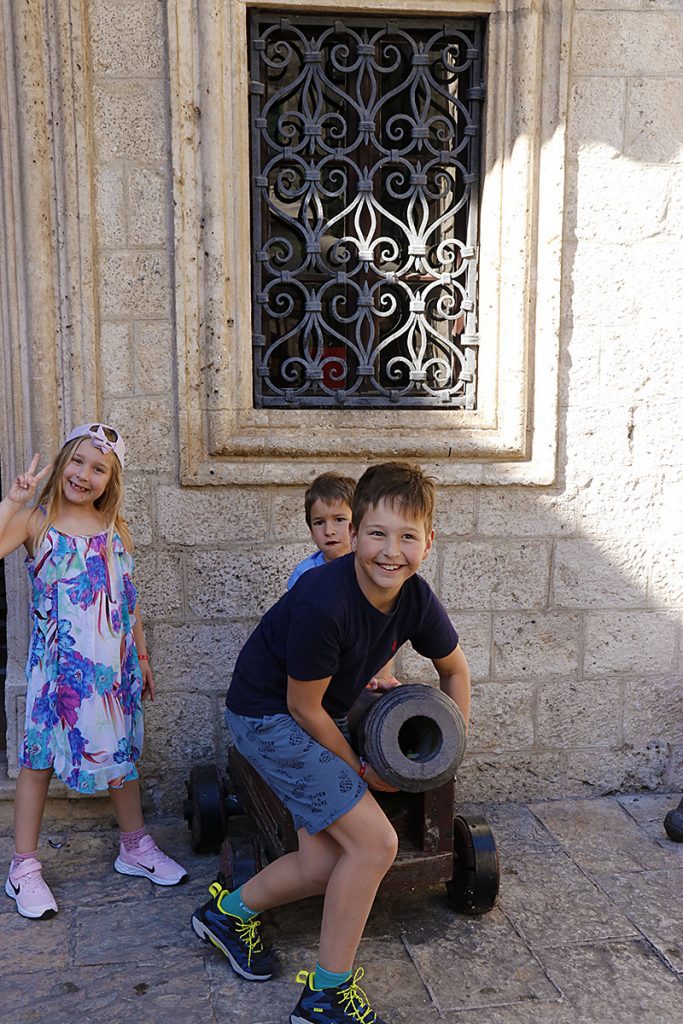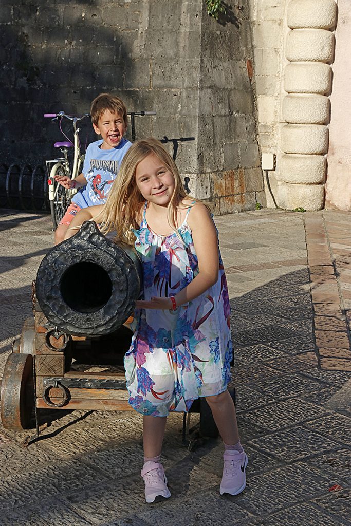 Sprehodili smo se po starem mestnem jedru in prišli do pomorskega muzeja, pred katerim je bil star top. Otroci so se spet zapodili proti topu in se veselo nastavljali, da sem jih fotografirala.