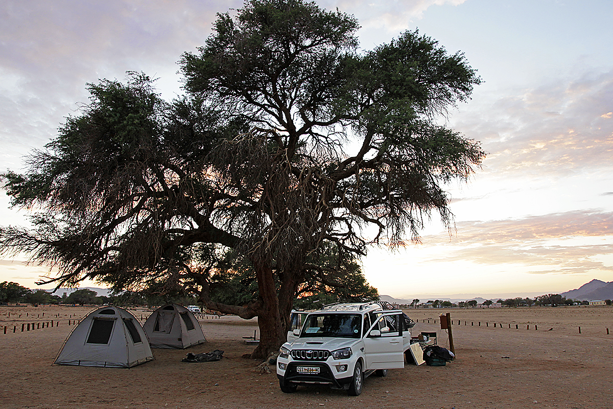 Ko smo se končno uspeli prebiti ven iz letališke zgradbe, smo v množici čakajočih takoj zagledali Dantesa, našega vodiča. V Južni Afriki ima svojo agencijo Kalahari Tours and Travel in z Damirjem sva že dvakrat potovala z njim po Afriki. Dantes nas je čakal več kot eno uro, da smo uredili vse formalnosti in se pojavili pred njim. Ko smo skupaj odšli na parkirišče, kjer je pustil avto s katerim se bomo vozili po Namibiji, nam je zastal dih, ko smo ugotovili, da se bo naša prtljaga vozila z nami v prašni ogromni torbi na vrhu prikolice, privezana z navadno vrvico na rob prikolice. Takoj smo začutili pridih avanture, ki nas je čakala prihodnje dni. Ni nam preostalo drugega kot da smo naložili prtljago na streho prikolice in se odpravili proti Sesriemu, našemu prvemu potovalnemu cilju.