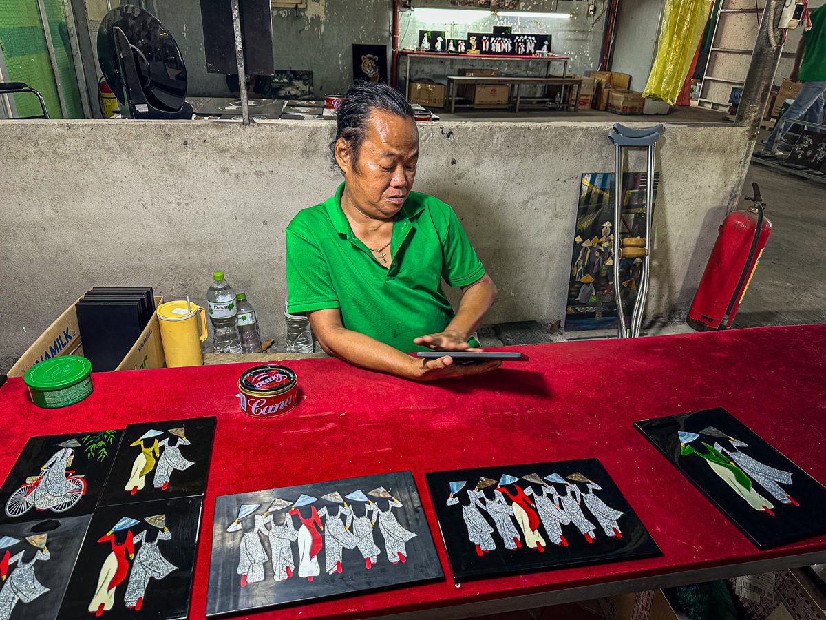 Ko sva končno prišla do vodičke, ki naju čakala izven zaprtega območja, smo se odpeljali do Cu Chi podzemnih rovov. Na poti do tja smo se ustavili v delavnici, kjer so invalidi izdelovali slike iz školjčnih lupin. V Vietnamu je zelo veliko invalidov. Vsepovsod vidiš ljudi na vozičkih, brez nog, rok. Vse to so posledica vojne in to ne samo zaradi eksplozij, ampak tudi zaradi genetskih napak, do katerih je prišlo zaradi herbicidov in drugih strupov, ki so jih Američani uporabljali v vojni. Za invalide poskrbijo tudi tako, da jih zaposlijo v številnih delavnicah, kjer izdelujejo različne izdelke, ki jih zelo nevsiljivo ponudijo turistom.