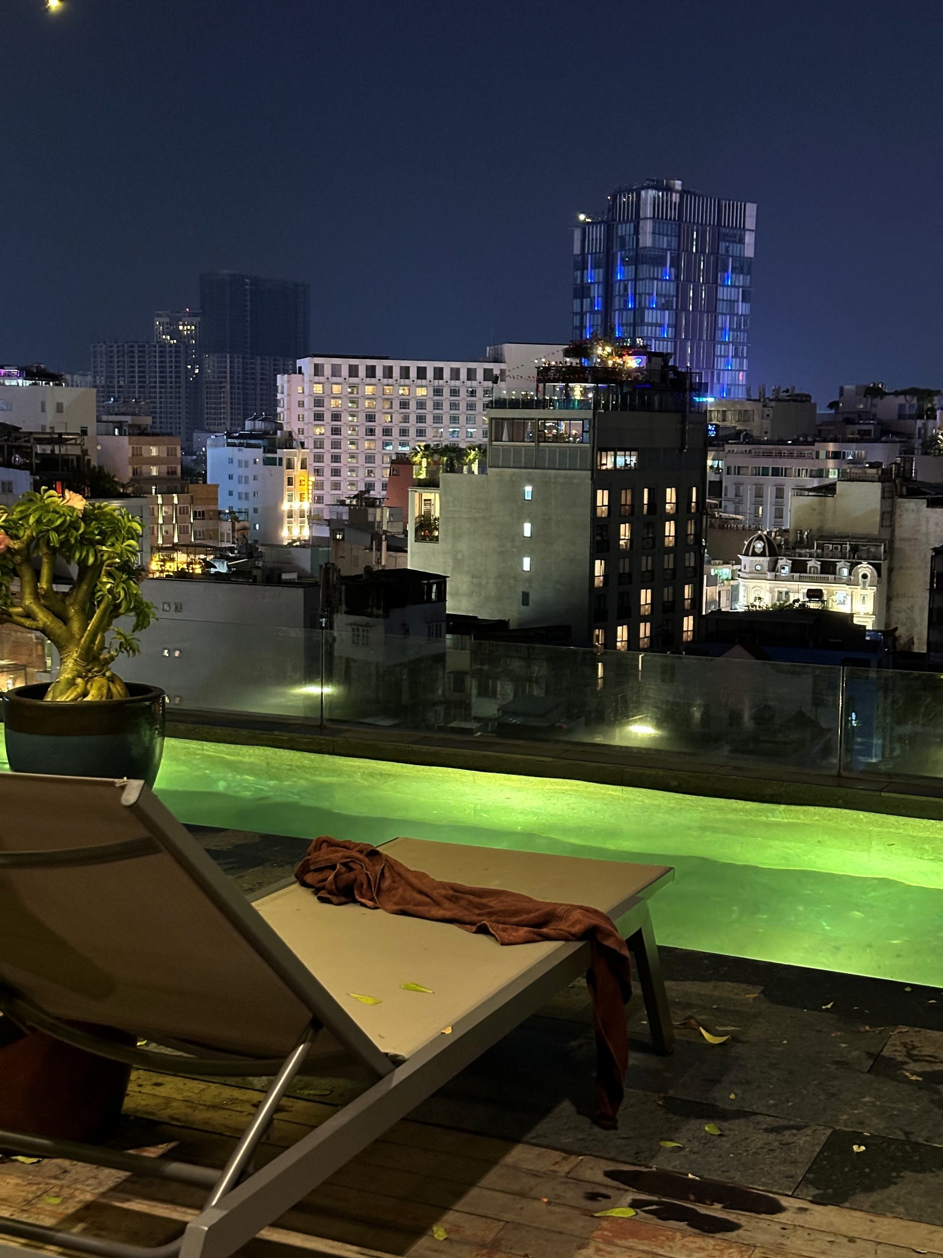 Večer sva zaključila ob bazenu na strehi najinega hotela, od koder sva imela čudovit pogled na nočni Ho Chi Minh City.